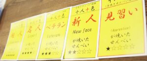 焼き体験が終わったら、焼き上がったせんべいを受付へ持って行きます。生地がどれだけ大きく、丸く焼いたかによって、スタッフが以下の評価を下します。