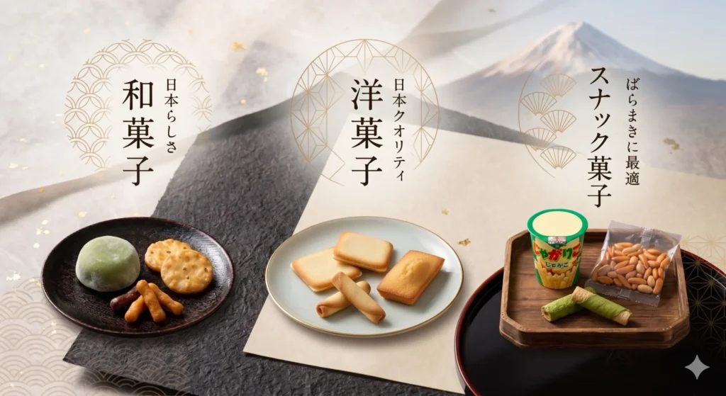 外国人へのお土産選びは、大きく「和菓子」「洋菓子」「スナック菓子」の3種類に分けて考えると選びやすくなります。それぞれの特徴と、喜ばれやすい商品を整理します。