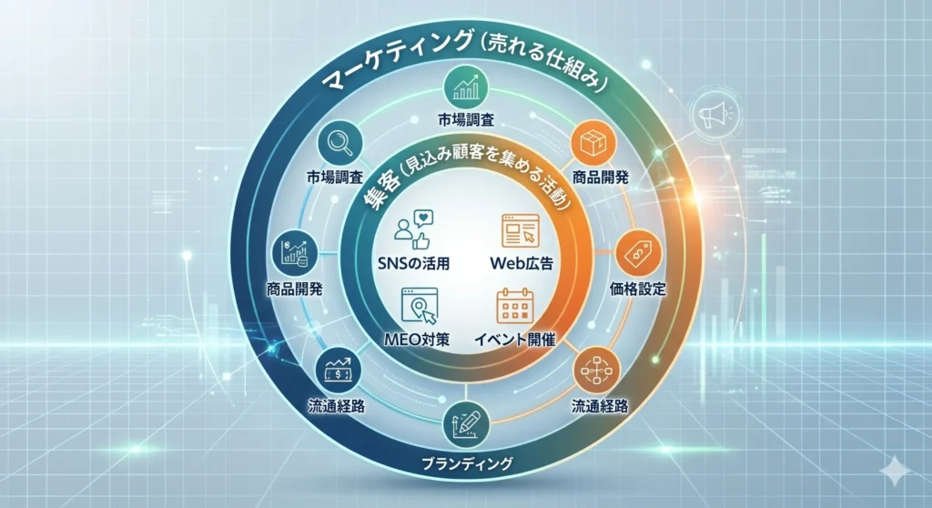 まず、集客とマーケティングの全体像を捉えることから始めましょう。多くの経営者や現場の担当者が、お客様を呼ぶことそのものをマーケティングだと捉えがちですが、実際にはマーケティングという大きな器の中に、集客という重要な要素が含まれているという関係性にあります。