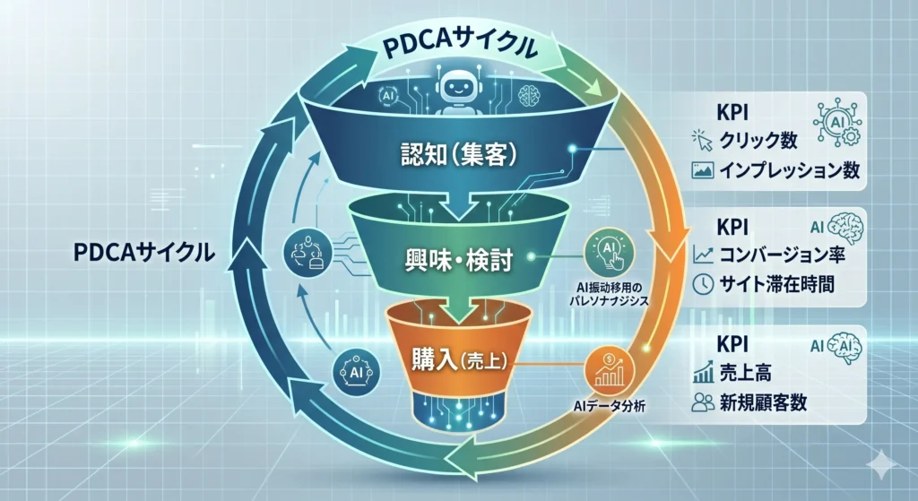 現在はAIツールを用いることで、ユーザーがサイト内のどの部分に興味を持ち、どの段階で離脱したのかといった詳細なデータをリアルタイムで解析することが可能です。こうした一連のプロセスを継続的に行うことで、集客の精度は高まり、無駄なコストを削減しながら売上を最大化させることができます。